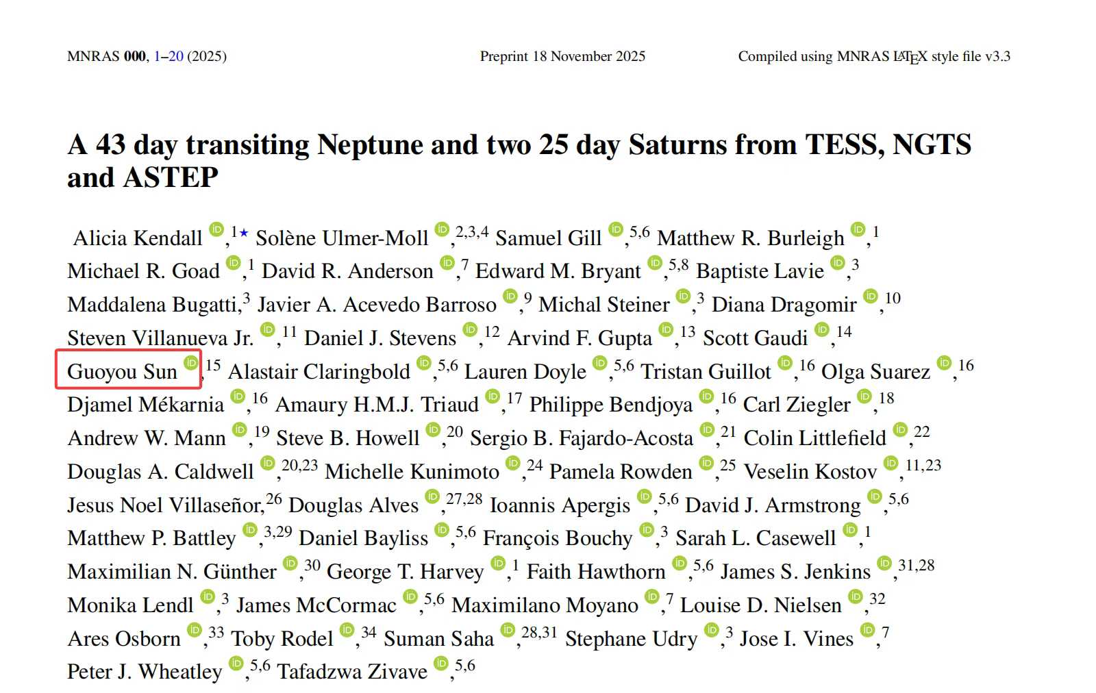 | 相关论文:A 43 day transiting Neptune and two 25 day Saturns from TESS, NGTS and ASTEP star, https://academic.oup.com/mnras/advance-article/doi/10.1093/mnras/staf2189/8378094 |